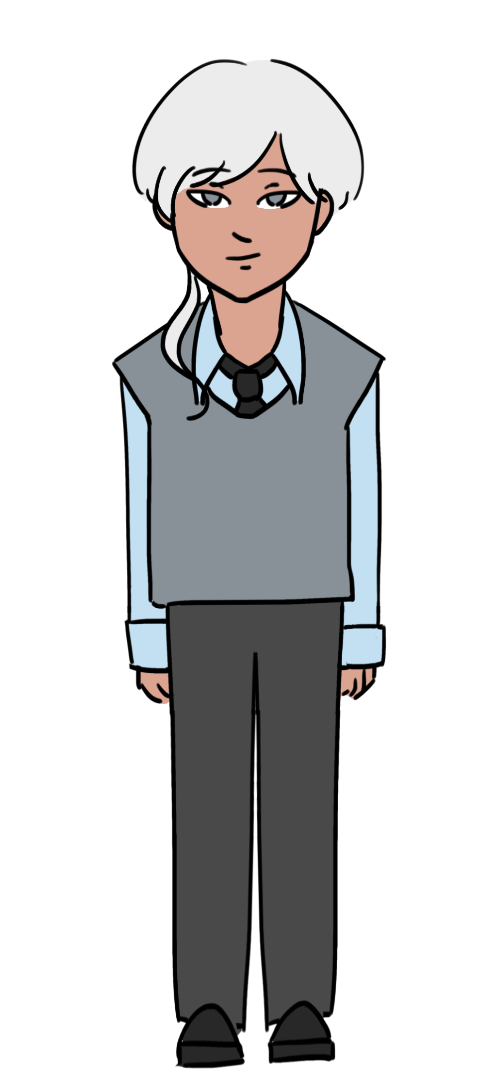 He has white hair and a rat tail. He is slender and lithe. His expression is a half lidded sly smirk punctuated with thin eyebrows. He dresses up like a teacher and loves semi-formalwear.