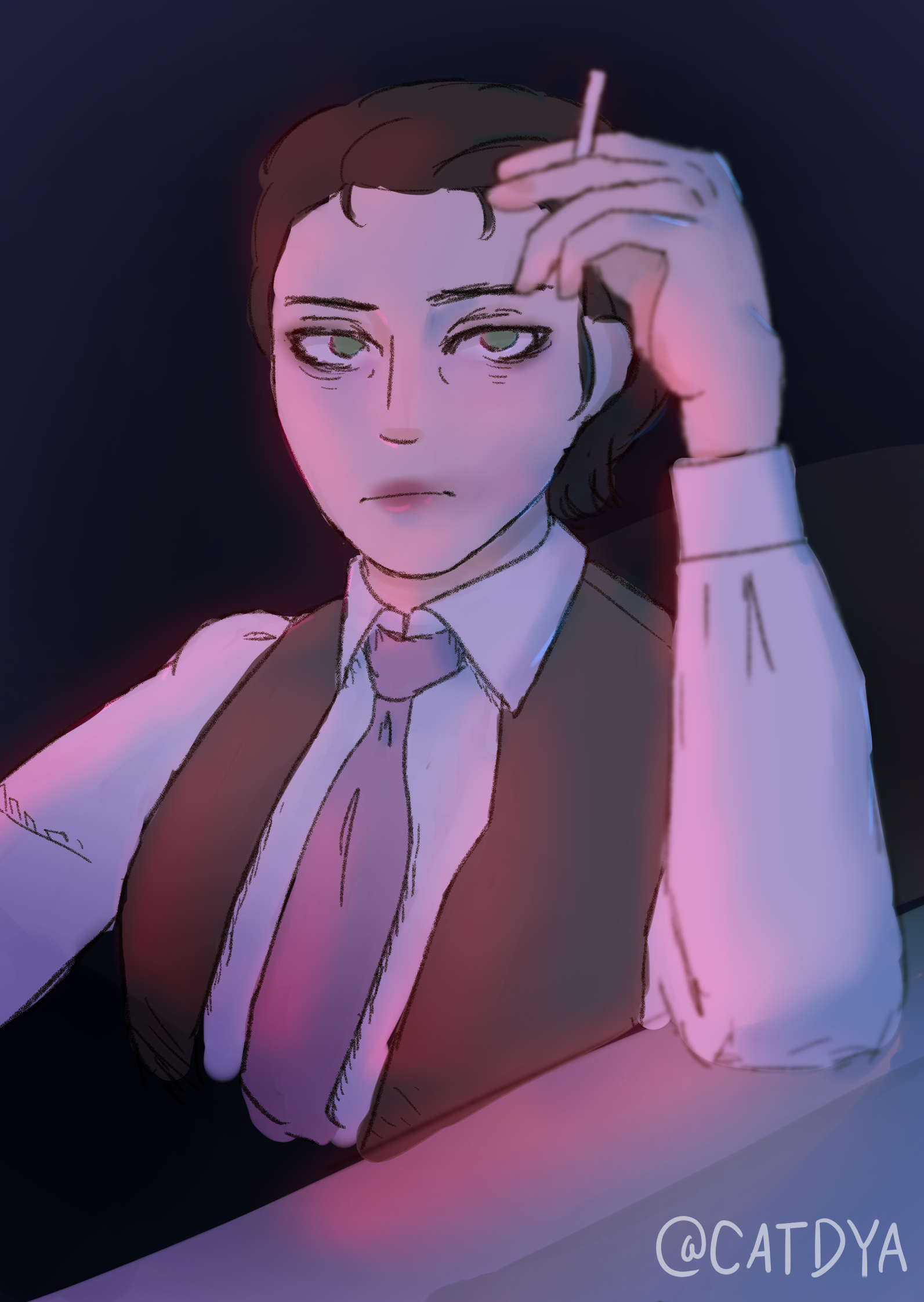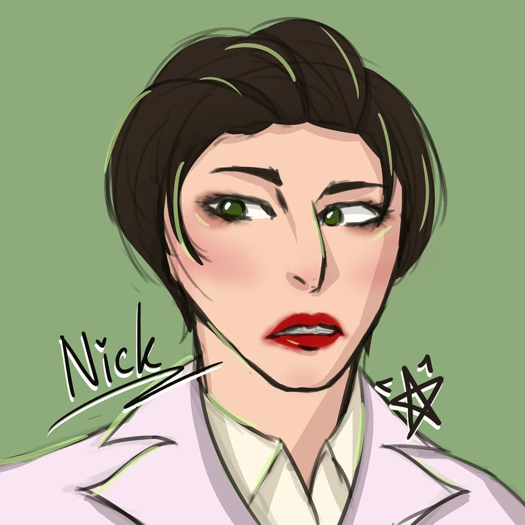 Nick loves dressing in suits. Her lilac blazer is based off a real-life blazer that I used to own. Key design points: eyebags, smudged mascara and lipstick, flyaway hairs.